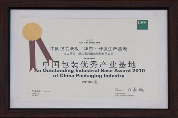 | 2006. | 04. | 景興紙業在世界包裝大會上被評為“中國包裝龍頭企業”,董事長朱在龍榮獲“中國杰出包裝企業家”,公司產品“牛皮箱板紙”獲得“中國包裝名牌產品”稱號。 |